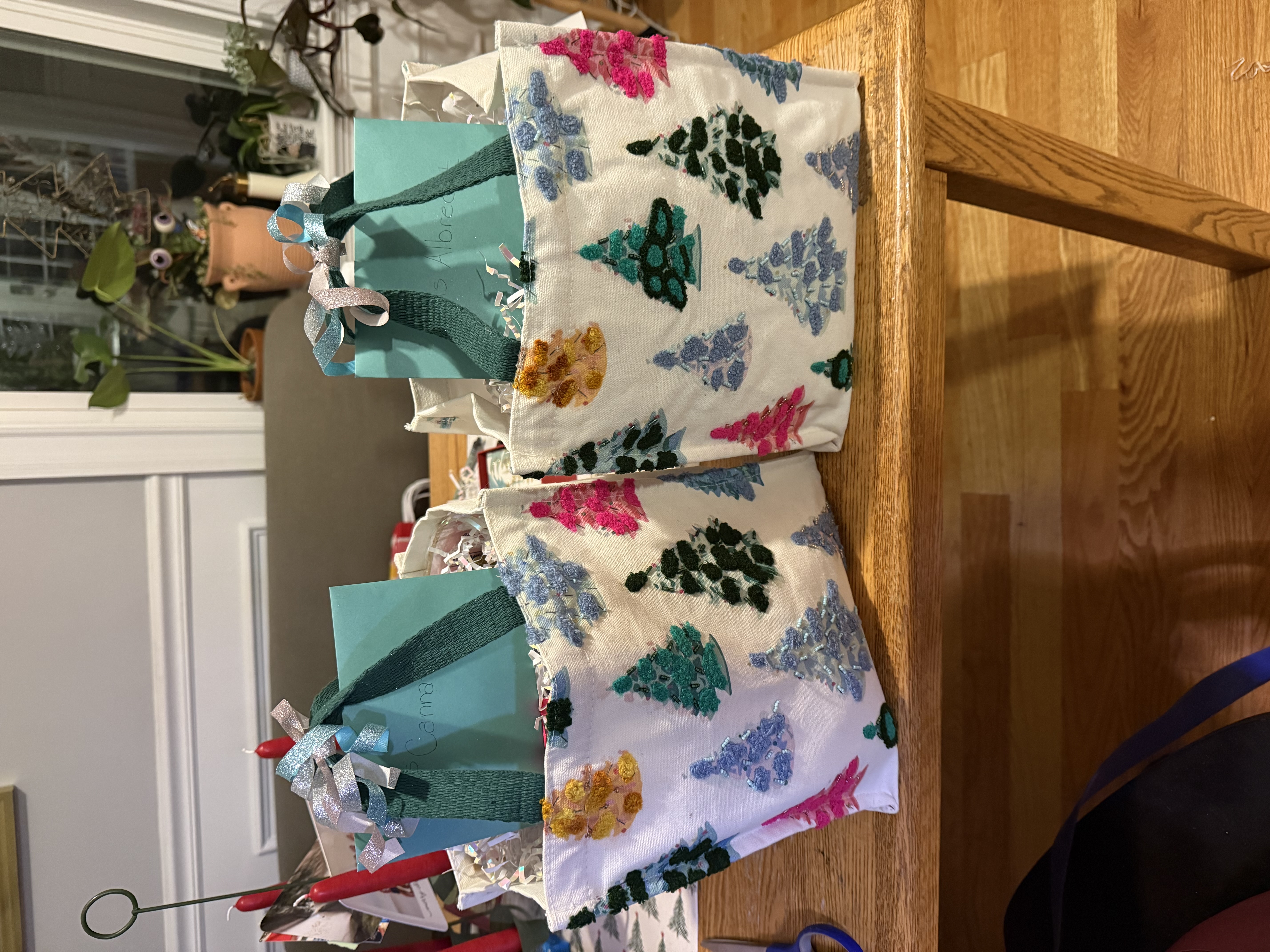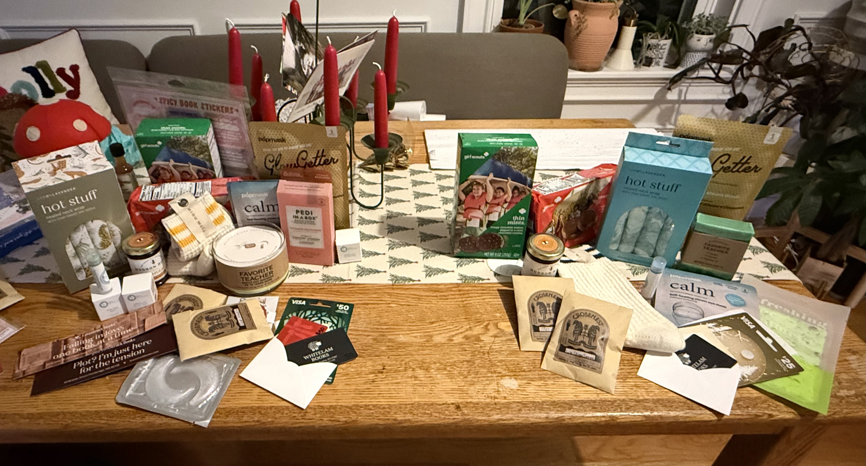 The tote bags are stuffed with gift cards to two book stores (Whitelam and Love Struck books), an Amazon gift card. Supplementary items to help kick off a relaxing break (cozy socks, warming neck wraps, eye masks, “favorite teacher candle”, pedicure in a box, at home facial, teas and more). Since both love Diet Coke they will also be receiving a giant box of Diet Coke with a bow on top as a funny gag gift.